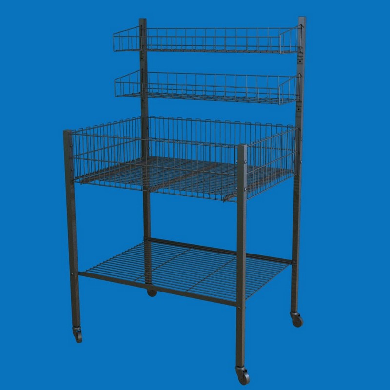 Модель оснащена основной вместительной корзиной и двумя сетчатыми полками, которые обеспечивают отличную видимость товаров и упрощают их сортировку по категориям. Сетчатая конструкция позволяет покупателям быстро ориентироваться в ассортименте и поддерживать аккуратный внешний вид выкладки.