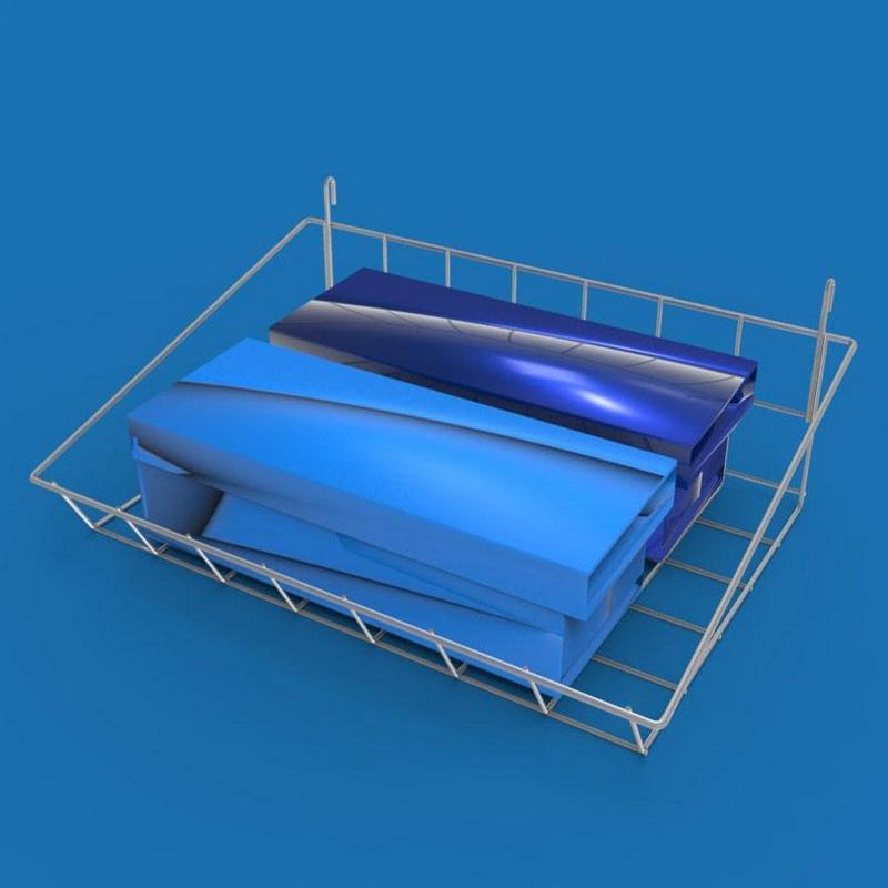На передней части корзины есть борт, который фиксирует товар. Такой вид полок можно легко перемещать и создавать функциональную и привлекательную витрину.