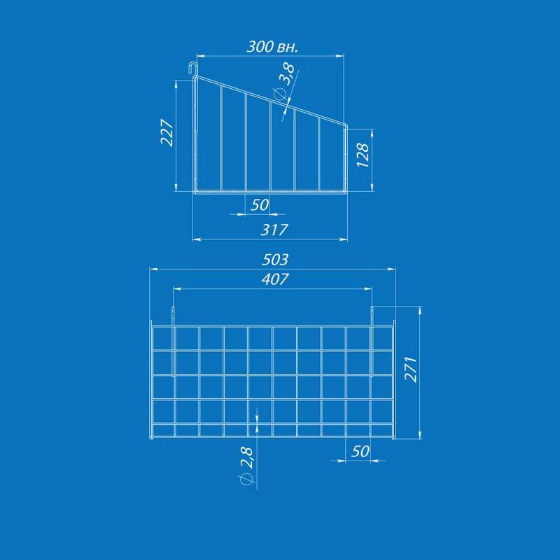 Корзина имеет два крючка, которые крепят её к торговой сетке с ячейками 50х50 мм или 100х100 мм.