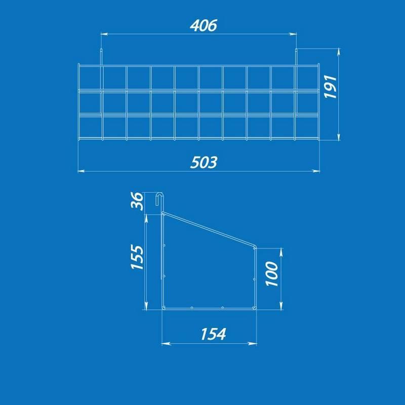 Корзина имеет два крючка, которые крепят её к торговой сетке с ячейками 50х50 мм или 100х100 мм.