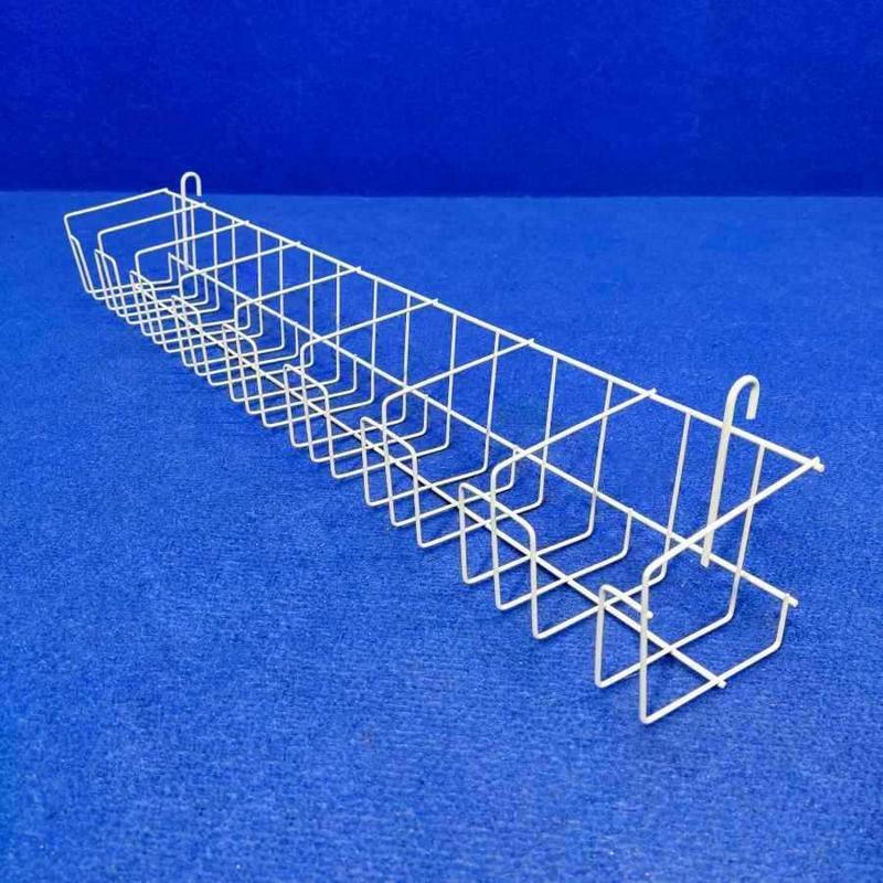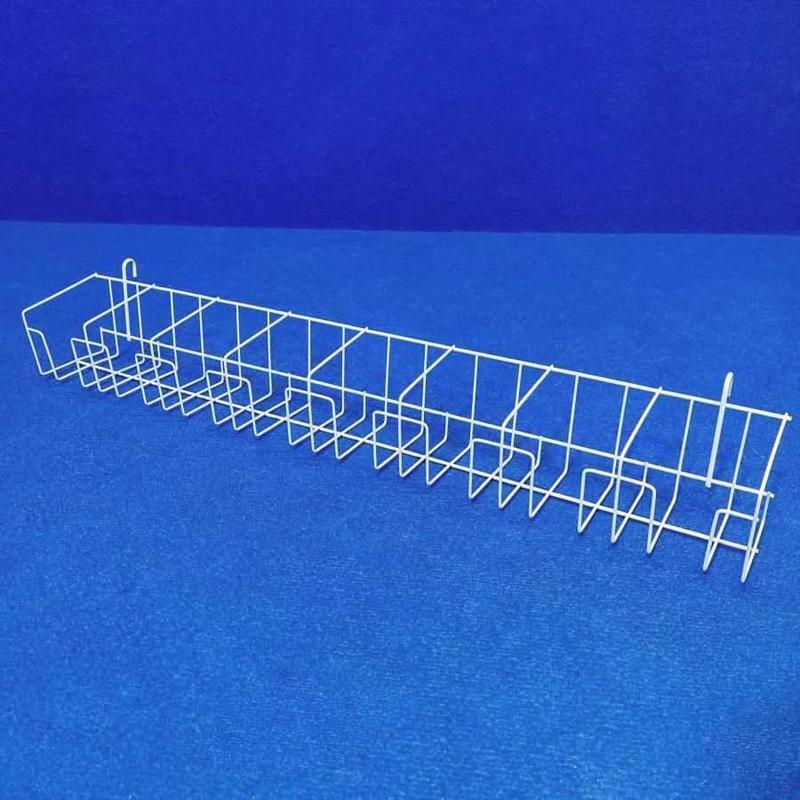 Полка имеет крючки для навешивания на сетку, что позволяет создавать торговую витрину. Подходит для размещения на торговой сетке с ячейкой 50х50 и 100х100.