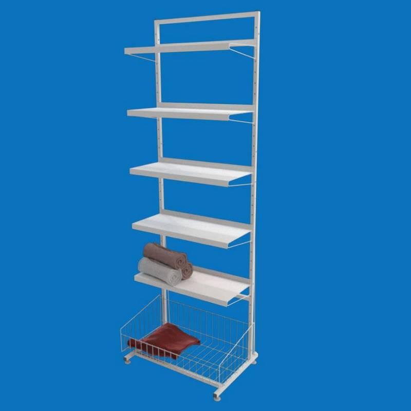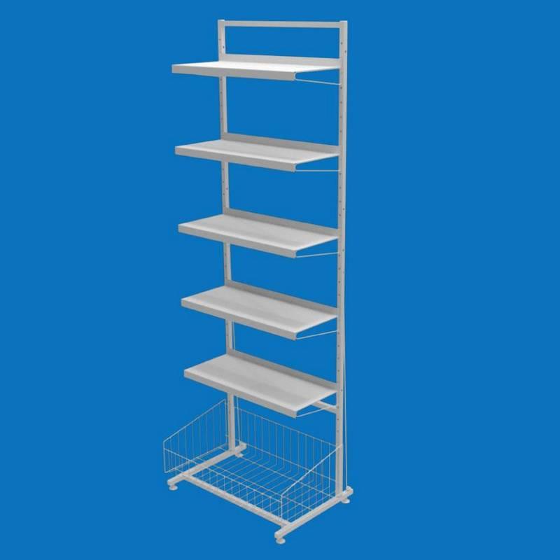 Торговий стелаж Ева з п'ятьма листовими полицями і 1 сітчастою накопичувальною корзиною