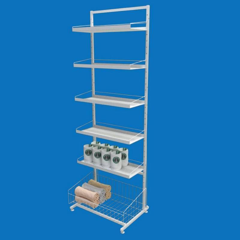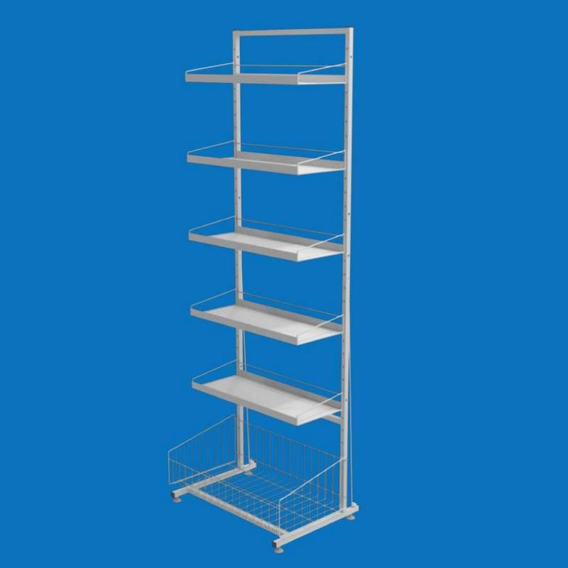Торговий стелаж Ева з п'ятьма листовими полицями і 1 сітчастою накопичувальною корзиною