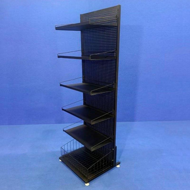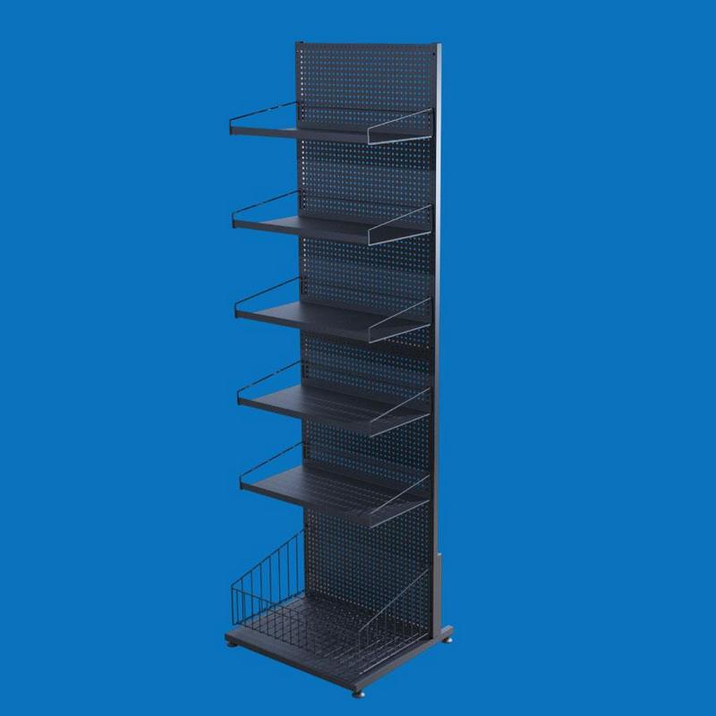 Торговый перфорированный стеллаж — универсальное и практичное решение для размещения широкого ассортимента товаров в торговом зале. Конструкция включает 5 полок и одну вместительную глубокую корзину, что позволяет удобно комбинировать выкладку товаров разного формата и размера.