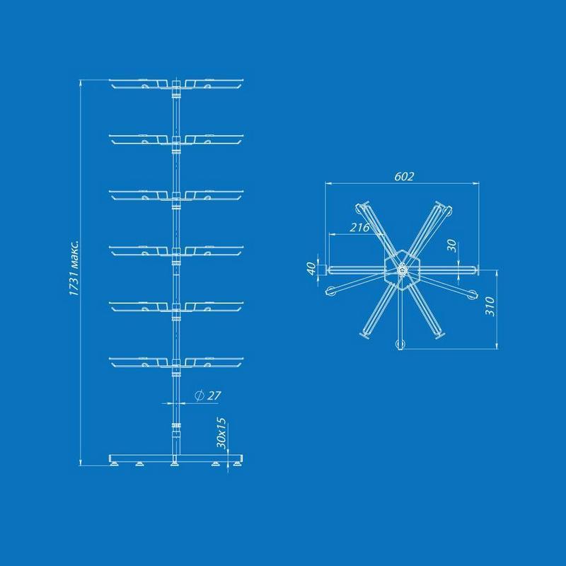 Стійка виготовлена з міцного металу і обладнана 5-променевою основою, яка забезпечує максимальну стійкість навіть при повному завантаженні. Конструкція легко збирається, не вимагає спеціальних інструментів, а завдяки продуманій формі займає мінімум місця в торговому залі.