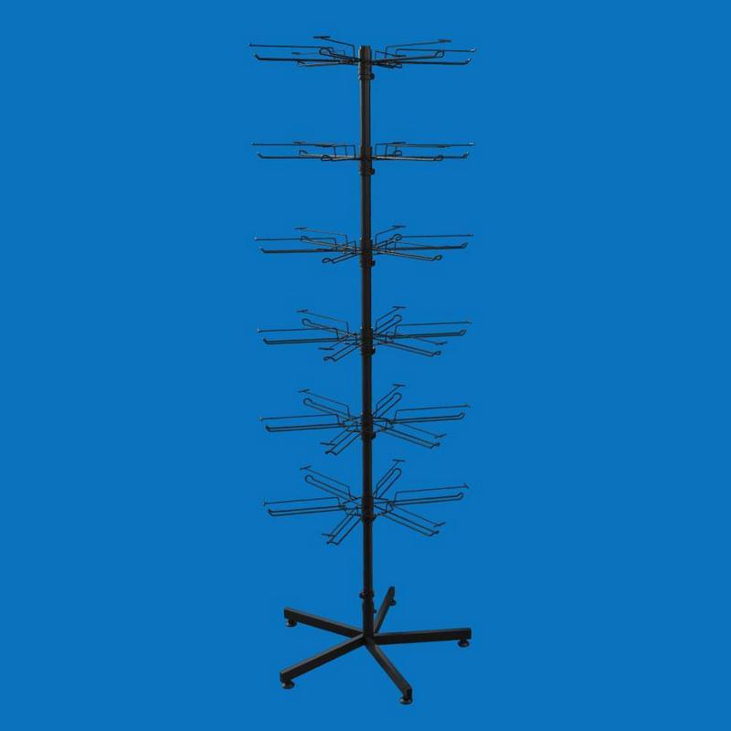 Торгова стійка на 36 подвійних гачків з цінникотримачами — універсальне рішення для магазинів будь-якого формату. Модель складається з 6 ярусів, на кожному з яких розміщено по 6 подвійних гачків, що дозволяє викладати велику кількість товару на мінімальній площі. Це ідеально підходить для пакетів, кімнатних тапочок, аксесуарів, ременів, парасольок, іграшок та інших підвісних товарів.