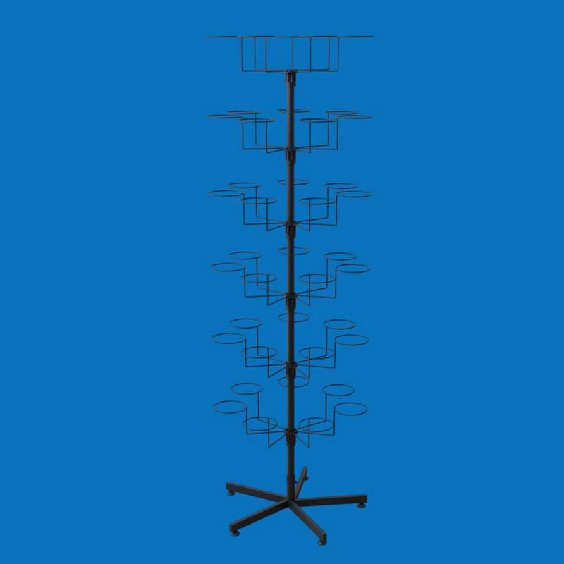 Напольная стойка на 5-лучевой опоре с 6-ю вращающимися ярусами на 42 кронштейна под шапки, кепки и другие головные уборы. Стойка чёрного цвета, компактная, устойчивая и готова к использованию сразу после сборки.