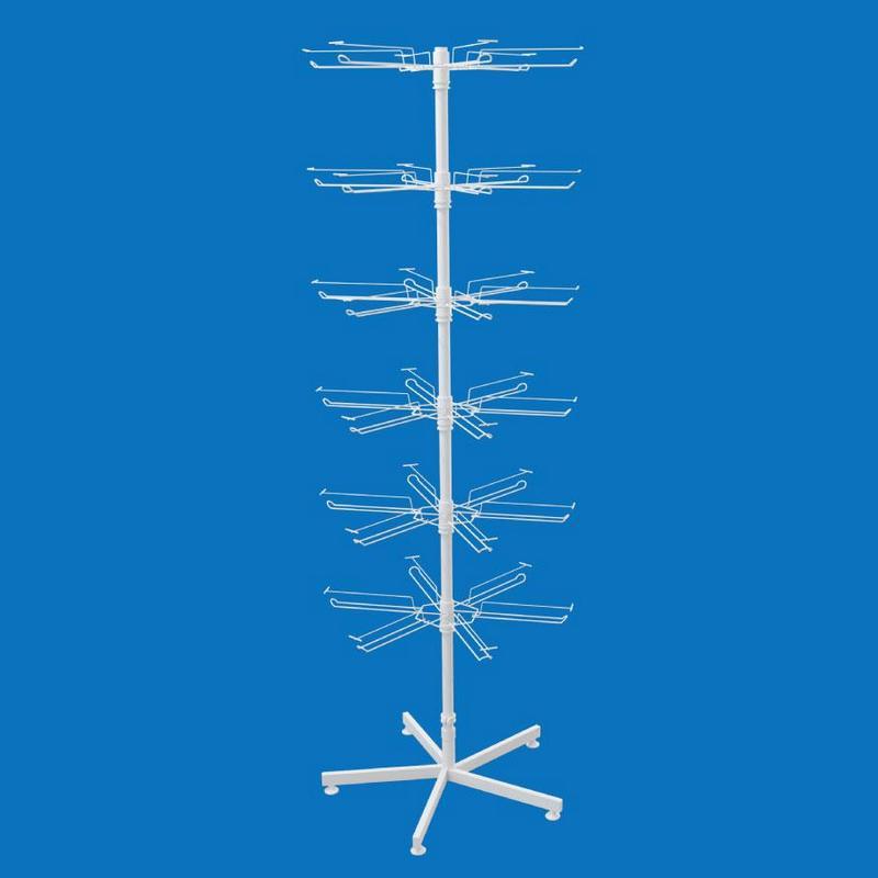 Торговая стойка на 36 двойных крючка — универсальное решение для магазинов любого формата. Модель состоит из 6 ярусов, на каждом из которых размещено по 6 двойных крючков, что позволяет выкладывать большое количество товара на минимальной площади. Это идеально подходит для пакетов, комнатных тапочек, аксессуаров, ремней, зонтов, игрушек и других подвесных товаров.
