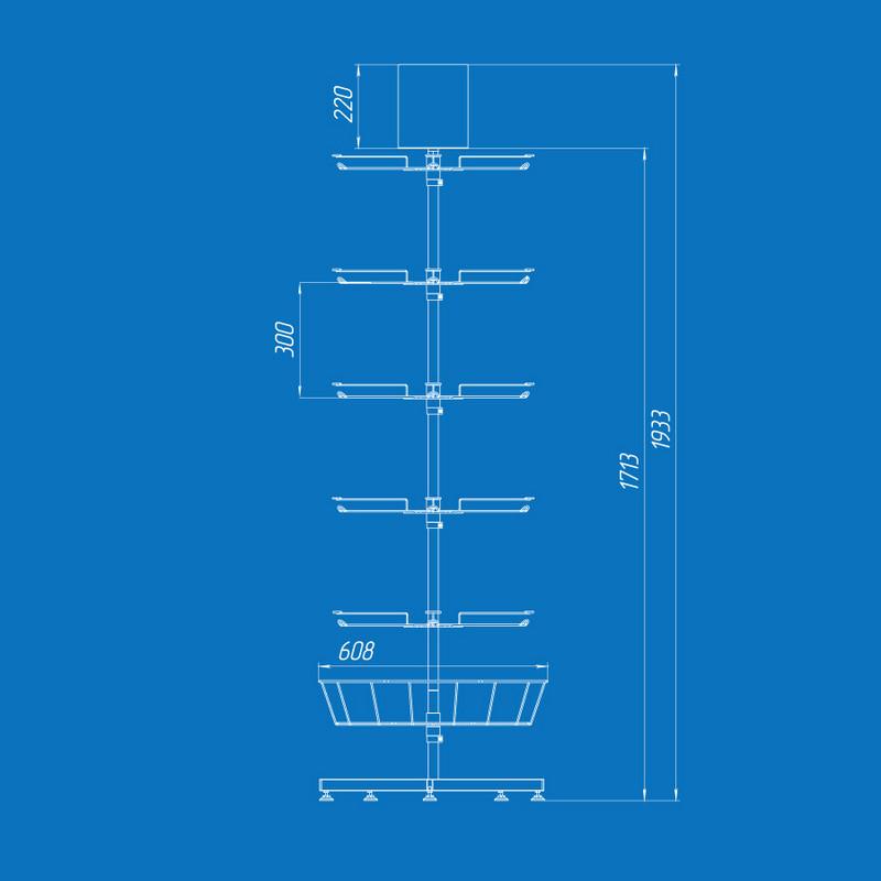 Универсальная торговая поворотная стойка повышенной прочности и устойчивости. Двойные крючки с ценникодержателями расположены ярусами по 6 штук. Каждый ярус поворачивается независимо от других и регулируется по высоте. Лишние ярусы можно снять или разместить дополнительные элементы на штангу Ø27 мм.