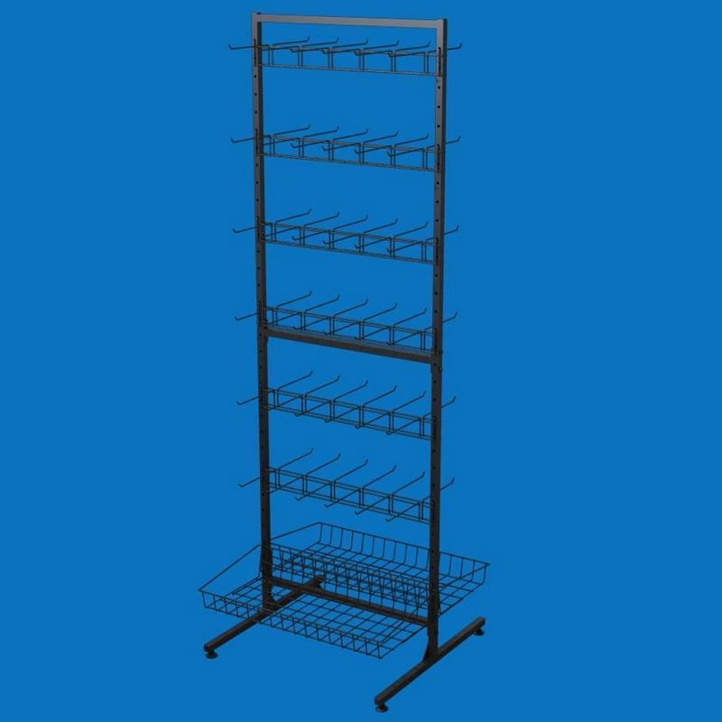Двухсторонний стеллаж с одинарными крючками и сетчатыми корзинами в черном цвете оснащен шестью ярусами одинарных крючков на каждой стороне, что делает его идеальным для демонстрации товаров в упаковке. Дополнительно, каждая сторона оборудована сетчатой корзиной, которая отлично подходит для размещения более габаритных товаров.