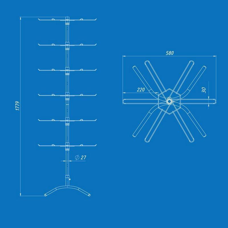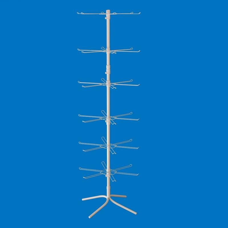 Торговая стойка на 36 двойных крючка — универсальное решение для магазинов любого формата. Модель состоит из 6 ярусов, на каждом из которых размещено по 6 двойных крючков, что позволяет выкладывать большое количество товара на минимальной площади. Это идеально подходит для пакетов, комнатных тапочек, аксессуаров, ремней, зонтов, игрушек и других подвесных товаров.