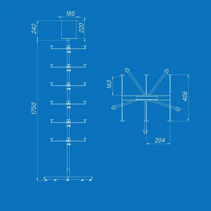 Модель обладнана 6 ярусами одинарних гачків. Усі яруси обертаються навколо центральної осі, забезпечуючи легкий доступ до продукції з усіх боків.