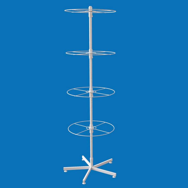 Металлическая напольная стойка с четырьмя вращающимися кольцами — удобное решение для размещения мелких товаров: носков, ремней, пакетов и других аксессуаров.