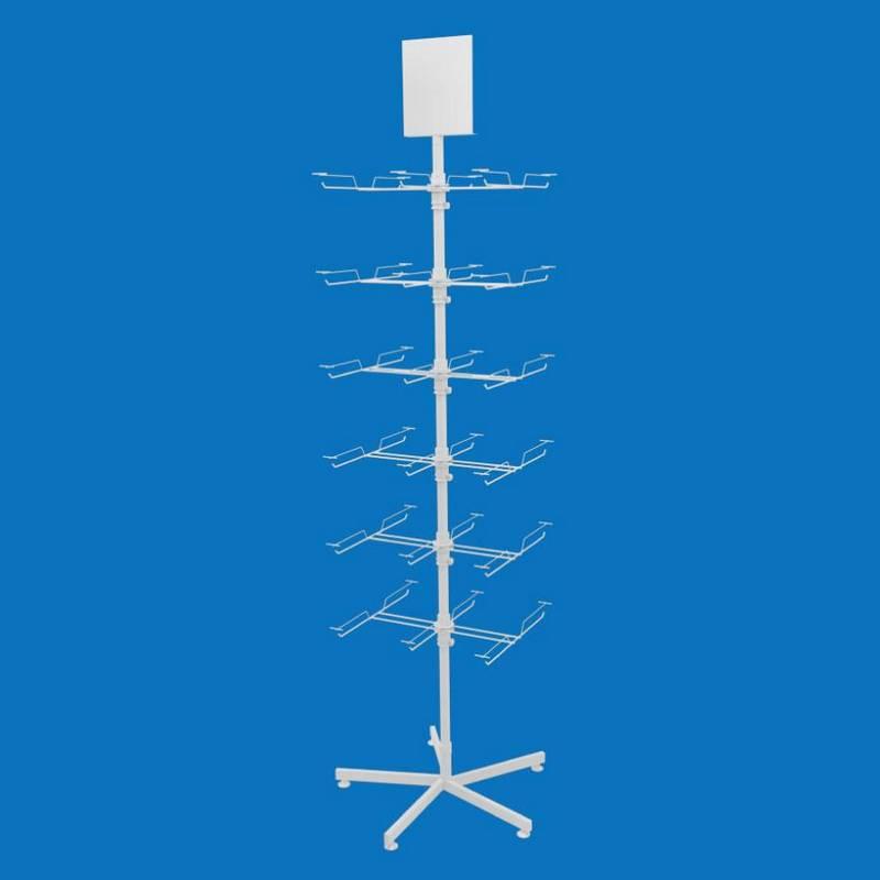 Модель оснащена 6 ярусами одинарных крючков, каждый из которых оборудован ценникодержателями для удобного отображения цены или информации о товаре. Все ярусы вращаются вокруг центральной оси, обеспечивая легкий доступ к продукции со всех сторон. Верхняя часть стойки укомплектована местом под ценник или рекламную табличку.