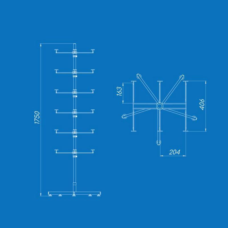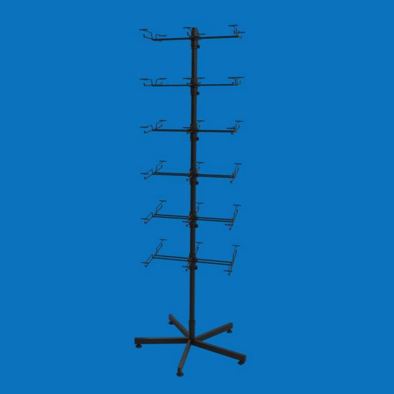 Модель оснащена 6 ярусами одинарных крючков. Все ярусы вращаются вокруг центральной оси, обеспечивая легкий доступ к продукции со всех сторон.
