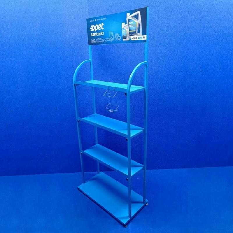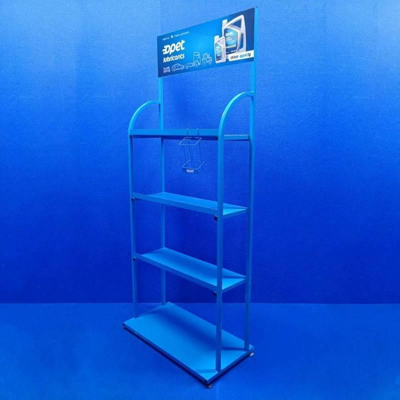 Торговий стелаж для автомасел на 4 полиці з рекламною панеллю, синій
