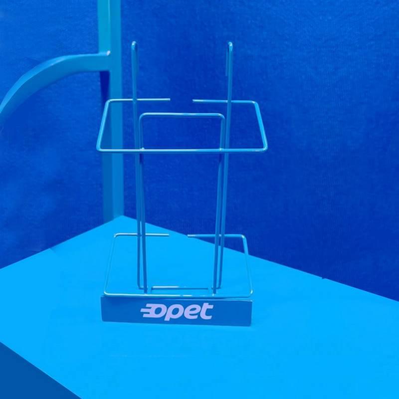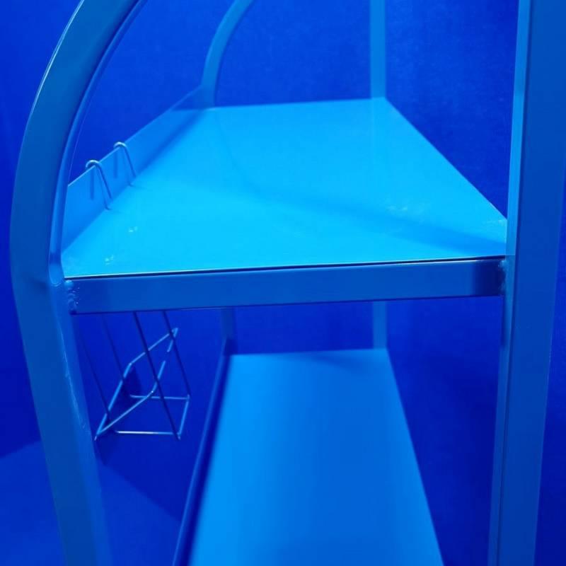 Металевий синій стелаж для автомастил з брендуванням і кишенею для візиток